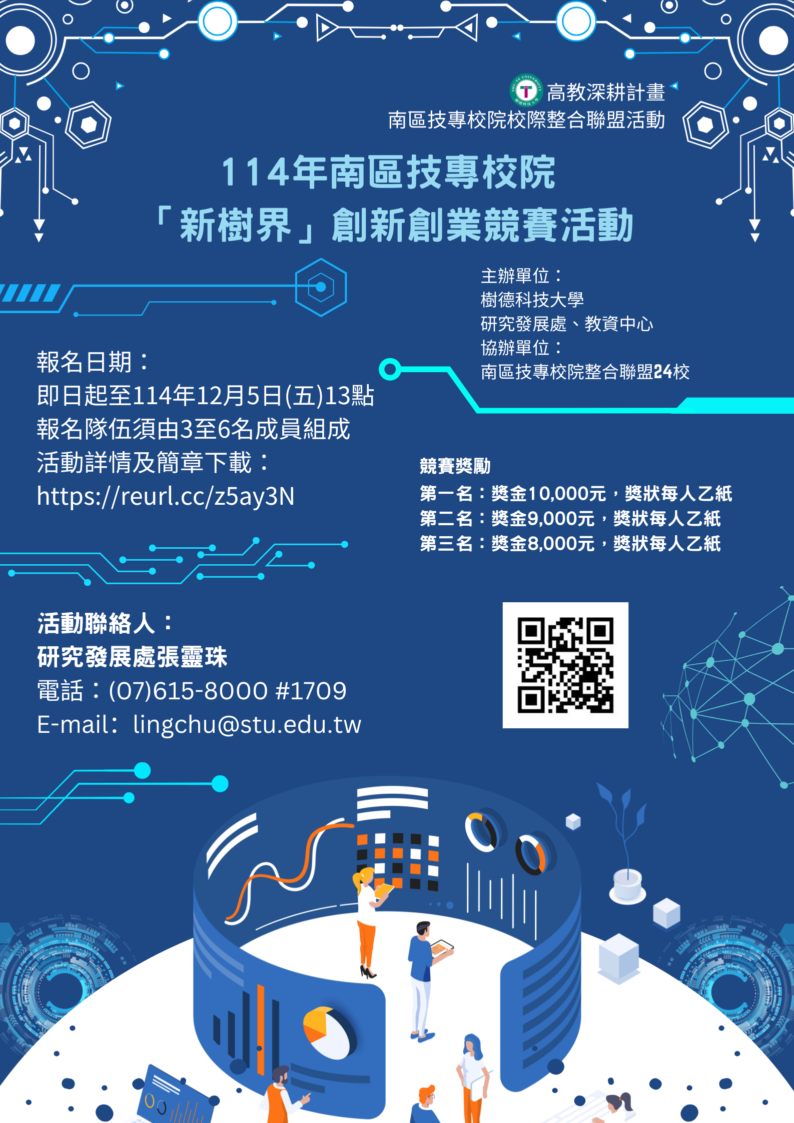 【產官學組】【轉知】樹德科技大學辦理「114年南區新樹界創新創業競賽」,請查照。