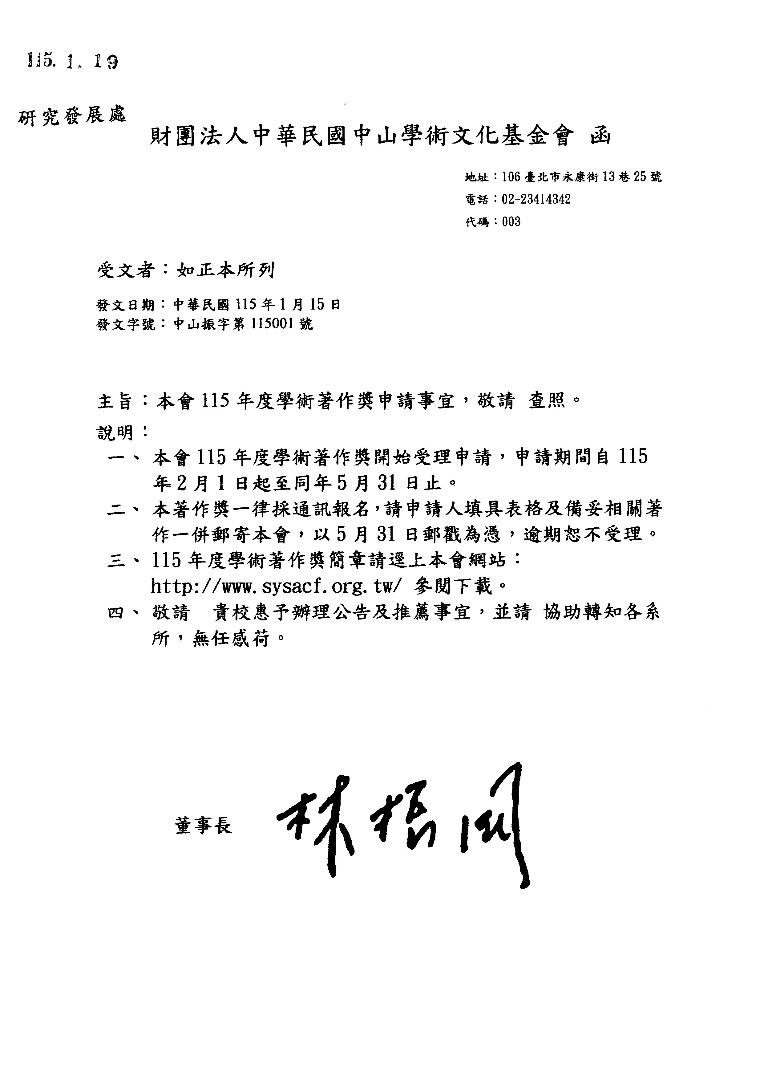 轉知財團法人中華民國中山學術文化基金會115年度學術著作獎申請事宜(如下)。