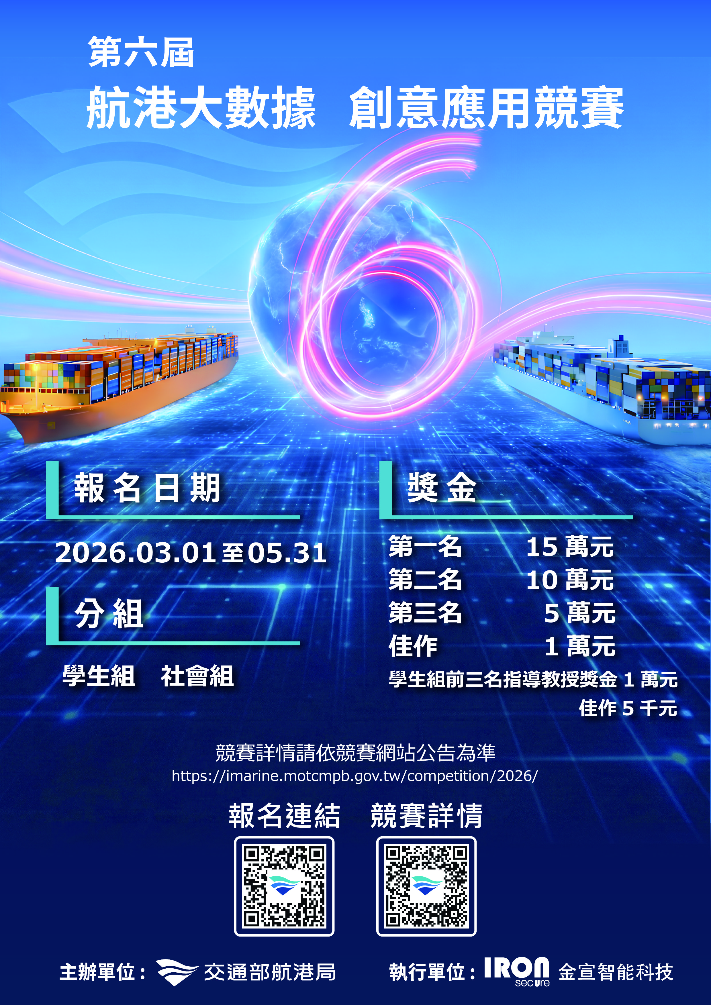 【產官學組】【轉知】交通部航港局辦理「第6屆航港大數據創意應用競賽」競賽,敬邀本校師生踴躍報名參加,請查照。